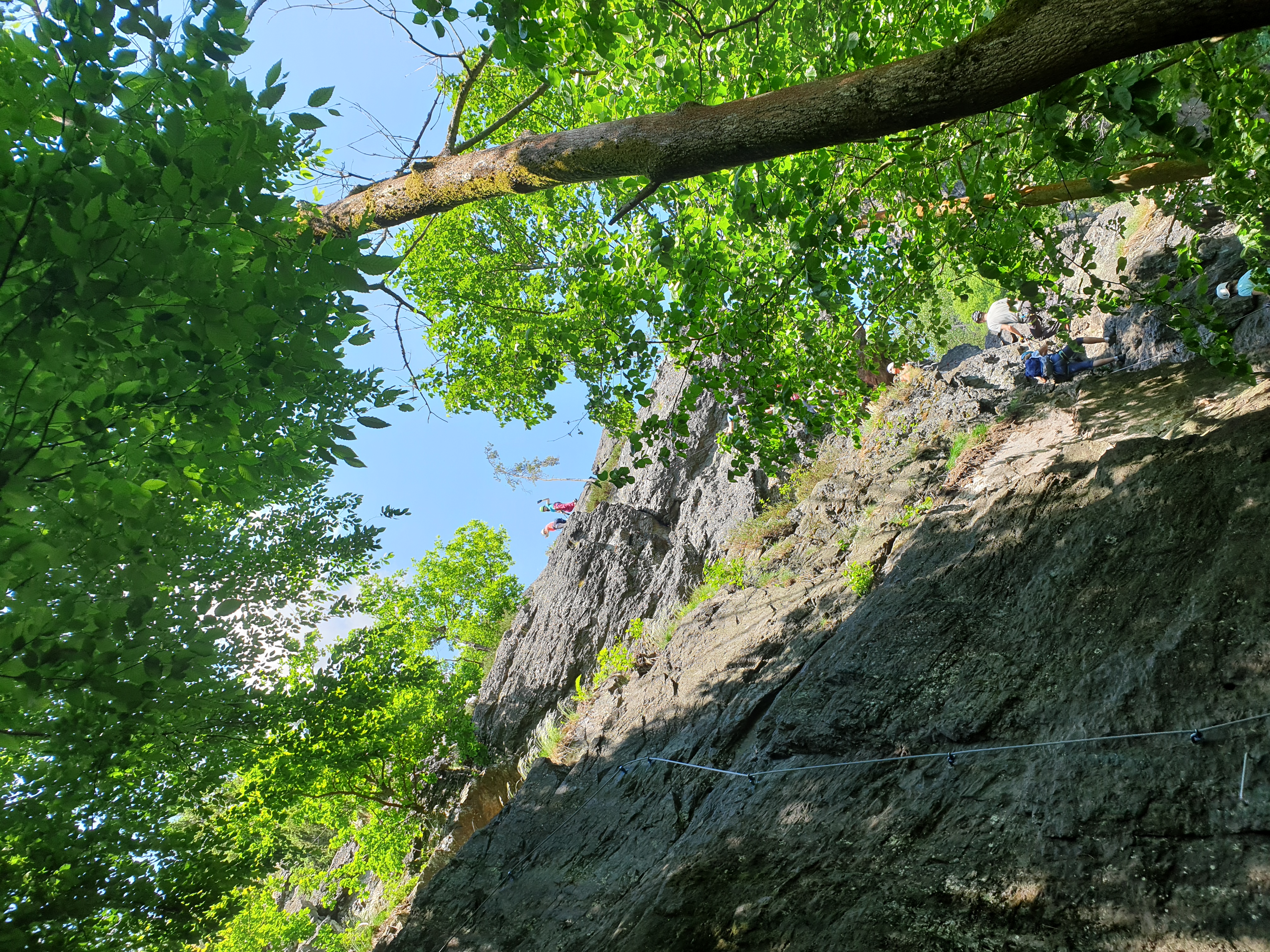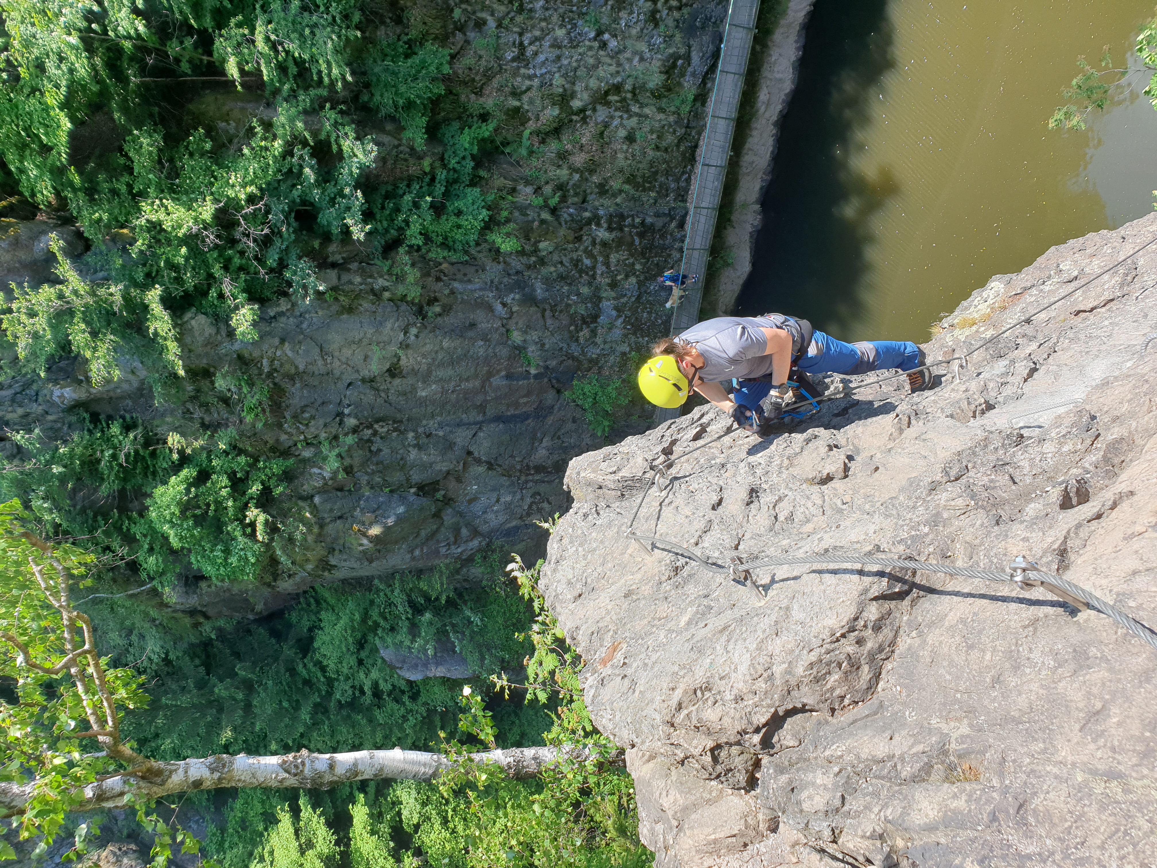 Dla nas idealnym wyborem była Via ferrata Vodni Brana w Czechach, która oferuje 3 trasy o bardzo zróżnicowanym charakterze. Na tej skałce byłem 4 razy, i wszystkie trasy udało mi się przejść już od pierwszego przyjazdu, chociaż niech was nie zmyli początek tego wpisu, bo za pierwszym razem na końcu trzeciej trasy wybrałem wariant ekstremalny, który z dołu wyglądał na łatwy, ale to właśnie tam zadrżały mi kolana i miałem strach w oczach. Problemem na tym odcinku było znaczne odchylenie ściany do tyłu, co utrudniało łatwe przepięcie się. Przy następnym przyjeździe znałem już ten kawałek i przepiąłem się szybciej, co bardzo ułatwiło mi przejście, ale zacznijmy od początku.